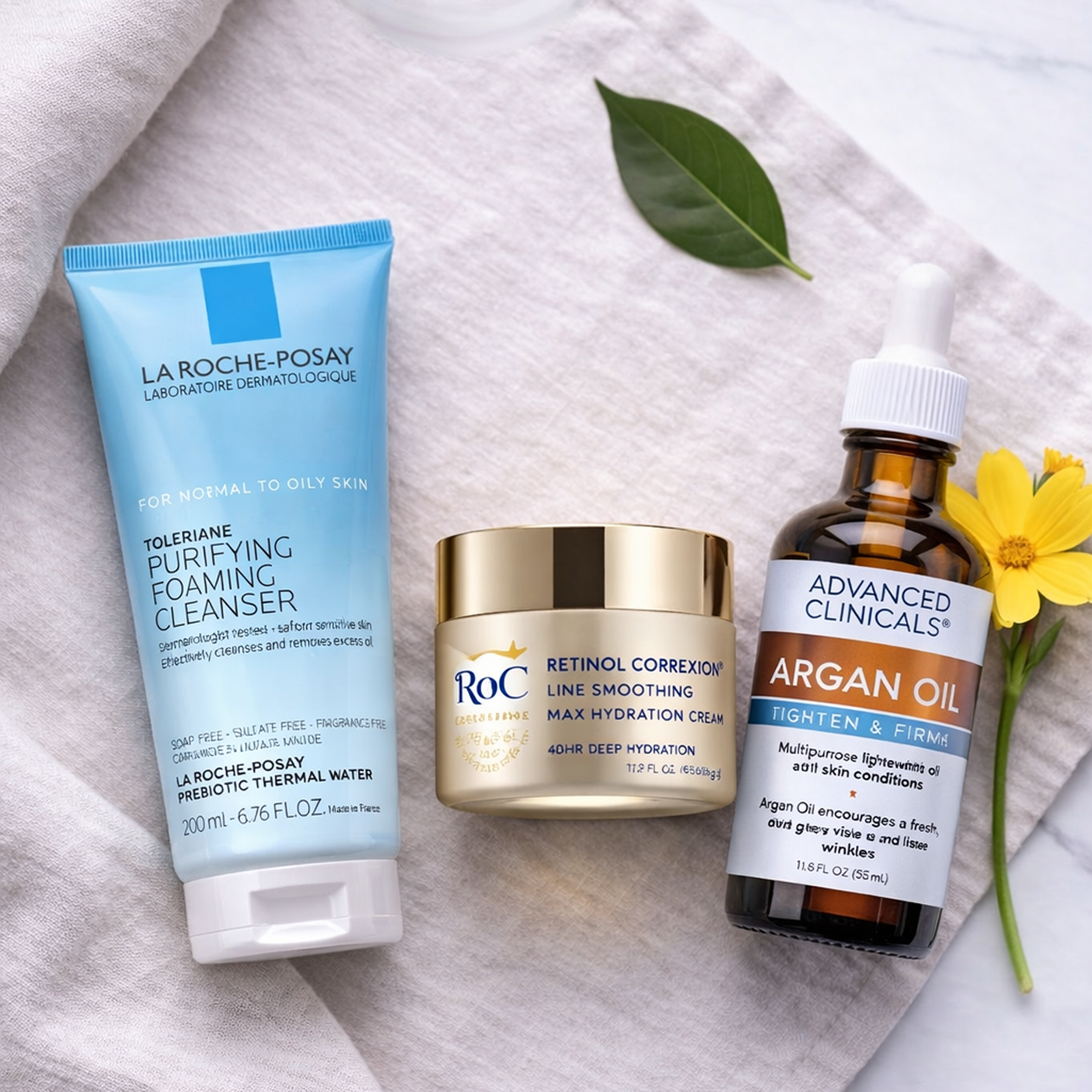 Visual: A clean, minimalist flat-lay of the RoC, UV Dox, and Advanced Clinicals bottles on a marble surface.