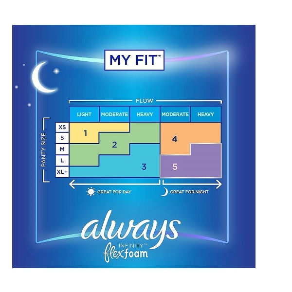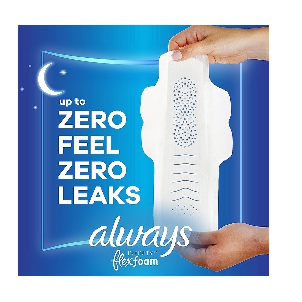 Always Infinity FlexFoam Pads for Women Size 4 Overnight Absorbency, Up to 12 Hours Zero Leaks, Zero Feel Protection, with Wings Unscented, 38 Count
