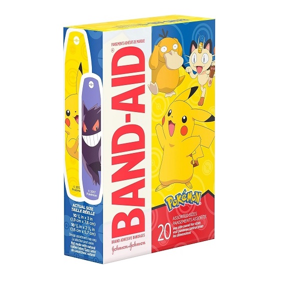 20 count box of decorative Pokémon Band-Aid Brand Adhesive Bandages for kids to cover and protect minor cuts and scrapes and to deliver daily wound care protection