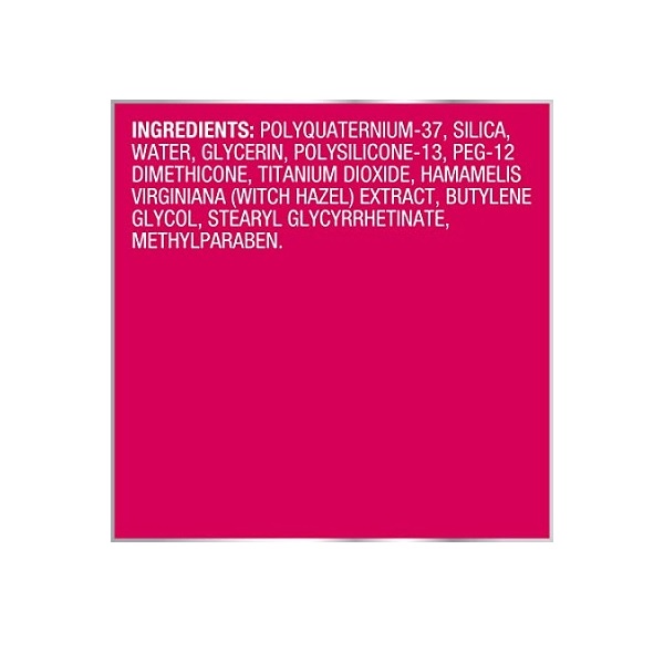 Polyquaternium-37, silica, water, glycerin, polysilicone-13, peg-12 dimethicone, titanium dioxide, methylparaben, aluminum hydroxide, butylene glycol, stearyl glycyrrhetinate, hamamelis virginiana (witch hazel) leaf extract.