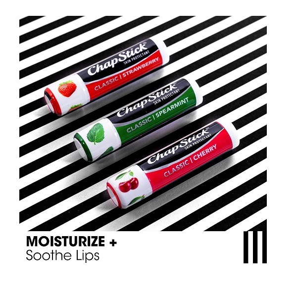 - One variety pack of three 0.15-ounce ChapStick Classic Spearmint, Cherry and Strawberry Lip Balm Tubes