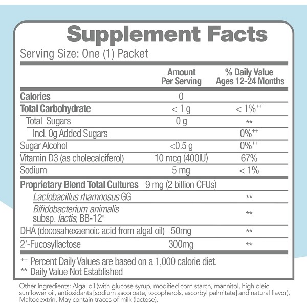 • FROM THE PEDIATRICIAN RECOMMENDED PROBIOTIC BRAND: Build a strong foundation for infants and toddlers with Culturelle Baby Healthy Development Probiotic, Vitamin D, HMO & DHA Packets formulated with 2 billion CFUs total of two of the most clinically studied probiotic strains; including Lactobacillus rhamnosus GG (LGG)