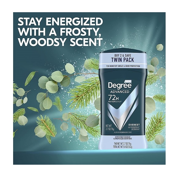 - With an Everest fragrance, you get an invigorating scent fusing frosty, piney and woody elements making this one of Degree’s best smelling deodorant for men.