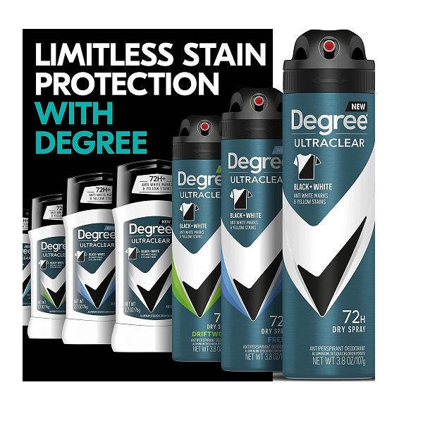 - Degree UltraClear Black+White combines our strongest protection against yellow stains and white marks with the same 48-hr protection you know – so your clothes stay protected and so do you