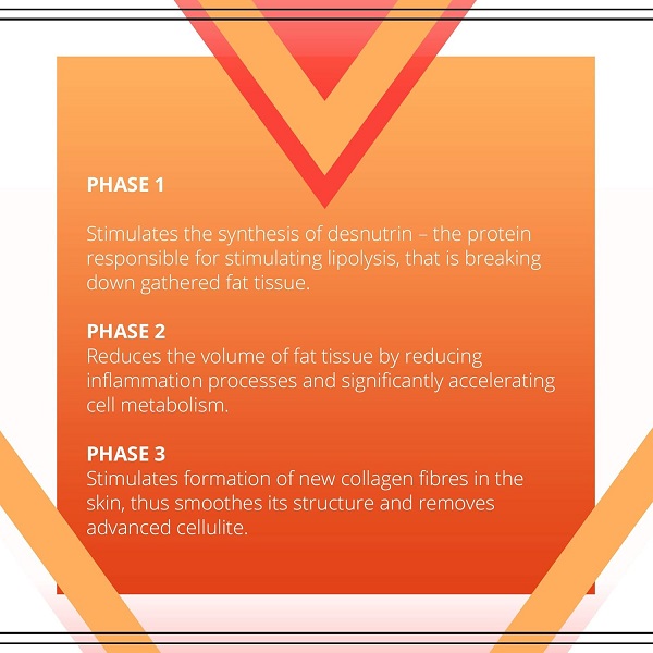 Inhibits growth of fat tissue. Visibly reduces the lumps and dimples under the skin, working on cellular level to effectively overcome stubborn fat cells and