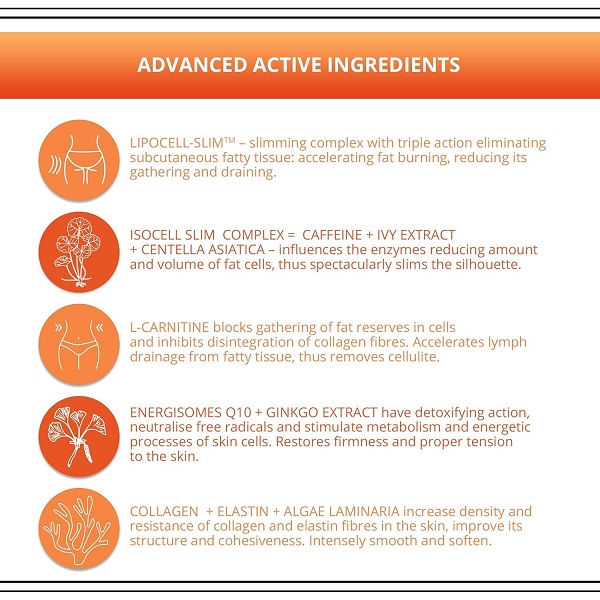 Lifts and firms the skin. Innovative ingredients energize the skin, improve blood circulation, tighten and firm the skin. Massaging the product into the skin helps with burning fatty deposits and purifies the skin