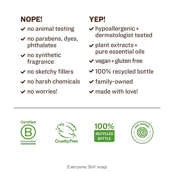 Clean Promise: Everyone 3in1 Soap is EWG verified, GMO free, cruelty free, gluten free, triclosan free, and synthetic fragrance free