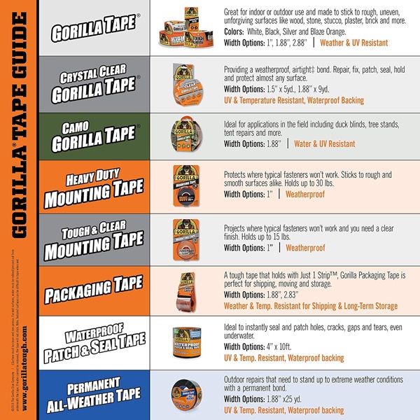 - Gorilla Waterproof Patch & Seal flexible tape has an extra thick adhesive layer and UV resistant backing