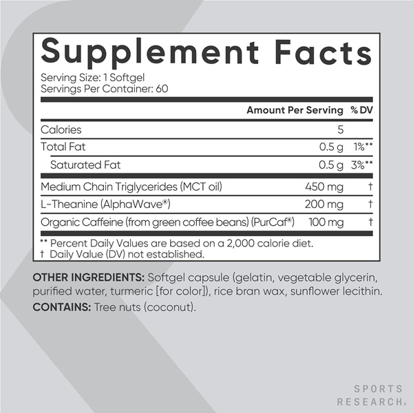 - CLEAN ENERGY: Just one of our liquid softgels provides 200mg of l theanine with 100mg of organic caffeine + coconut MCT oil for a convenient & economical alternative to sugary energy drinks and coffee.