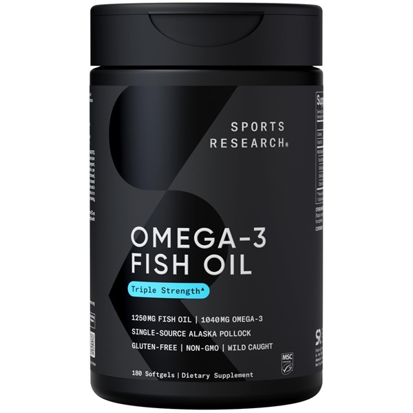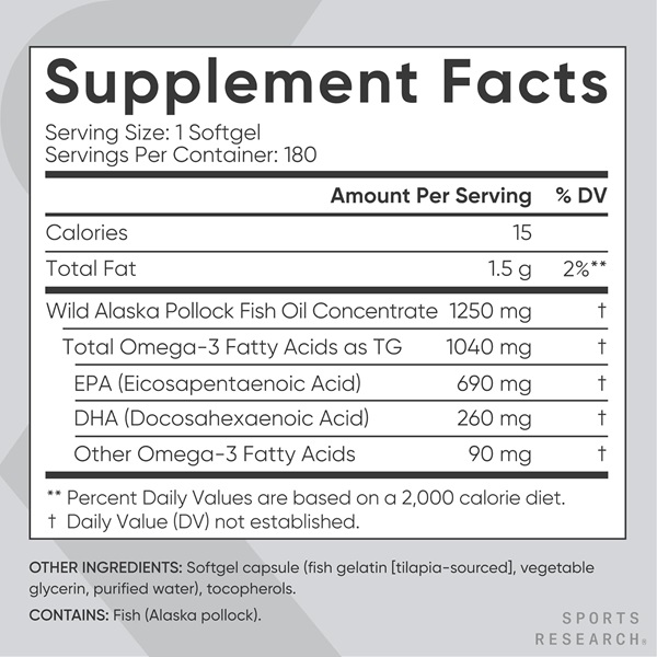 Sports Research Omega-3 Fish Oil From Wild Alaska Pollock (1250Mg Per Capsule) With Triglyceride Epa & Dha Fatty Acids|Heart, Brain & Joint Support|Ifos 5-Star Certified, Non-Gmo & Gluten Free (180Ct)