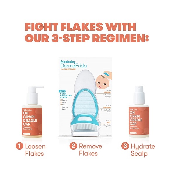The 3-Step Cradle Cap System by Fridababy | DermaFrida The FlakeFixer | Sponge, Brush, Comb and Storage Stand for Babies with Cradle Cap