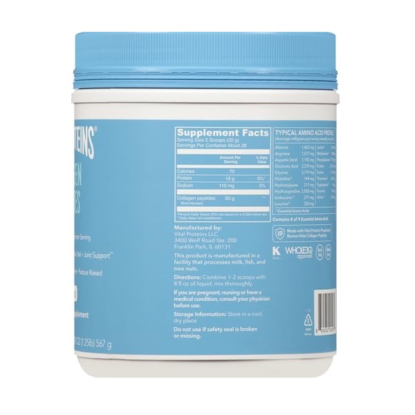 Vital Proteins Collagen Peptides Unflavored delivers 20g of high-quality hydrolyzed collagen per serving to support healthy skin, strong hair, nails, and joints. Made from grass-fed, pasture-raised bovine collagen, it dissolves easily in any hot or cold drink—without taste or texture. A daily essential for full-body wellness.